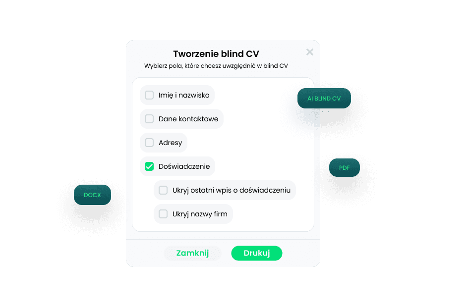 Nasz mechanizm Blind CV pozwala Ci precyzyjnie zaznaczyć, które pola chcesz ukryć przed wysłaniem profilu do klienta. System automatycznie generuje estetyczną, brandowaną prezentację kandydata do pdf lub docx, skupiając uwagę wyłącznie na Twoich założeniach.